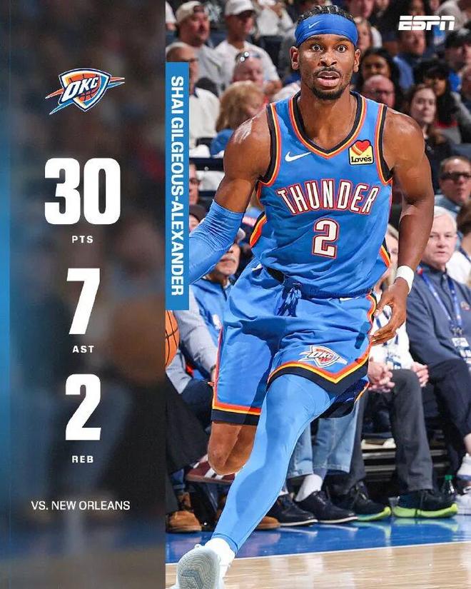 今天,亚历山大出战29分钟,14投8中,其中叁分球5投1中,罚球13投13中,真的汗都没怎么出,就得到30分2篮板7助攻1抢断。